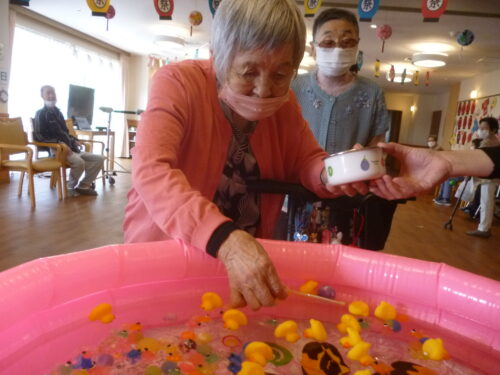 今年も射的や金魚すくい(ゴム製)、くじ引きを用意し、入居者の皆さまに楽しんで頂きました。今年はおみくじを引いてもらい、「大吉、小吉・・」「運勢は・・」と皆さん内容に一喜一憂していました。